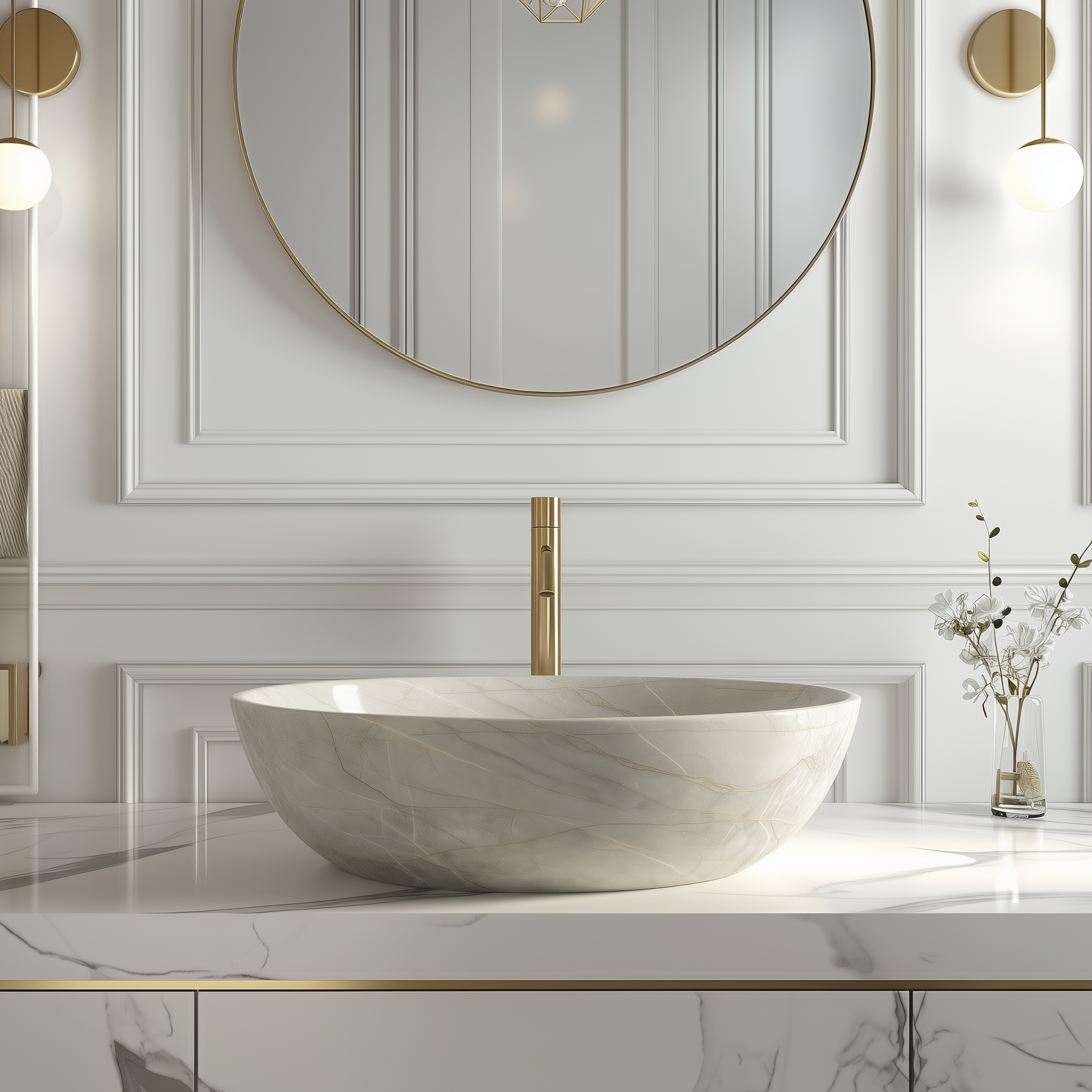 After quarrying, solid marble blocks are precision cut, sculpted and refined by skilled stone artisans to achieve flawless symmetry and finish. Each piece is carved from genuine solid stone, polished and sealed for long term durability in luxury interiors.